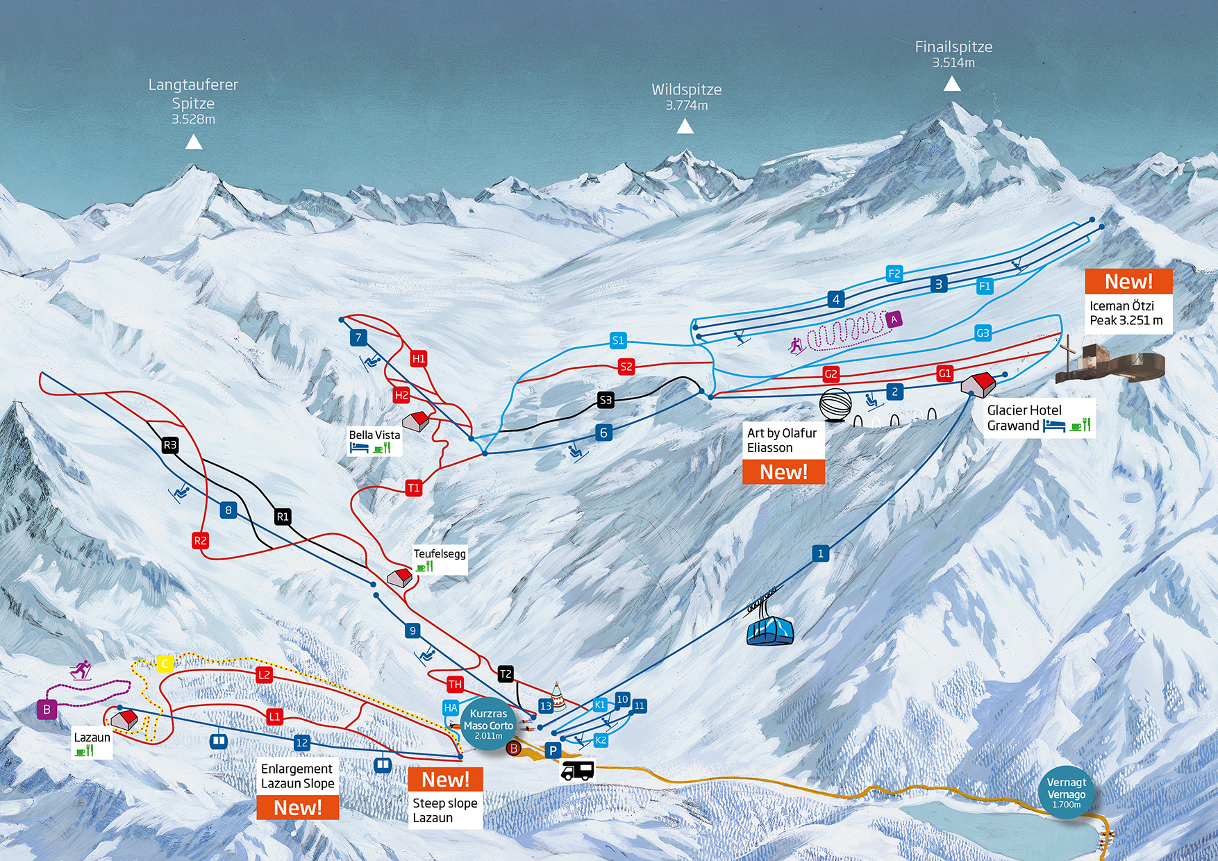 Whether wide and easy or steep and challenging: In the Val Senales glacier ski area you will find slopes of all levels of difficulty. You can reach them with the Lazaun, Teufelsegg and Roter Kofel chair lifts. If you prefer to breathe in the glacier air, you can reach more than 3,000 metres in altitude and other exciting slopes by cable car. The practice slopes at the Lazaun and Glocken lifts with a children's area, Indian tepee tent, ski carousel and magic carpets are waiting for your little skiers. Are you a freerider? Then you will also find plenty of touring options and off-piste run in Val Senales.