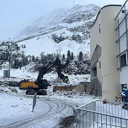 Die Abbrucharbeiten der bestehenden Strukturen an der Talstation sind abgeschlossen. Das Fundament für das neue Restaurant mit Bar und Après-Ski, das direkt an der Talstation entsteht, wurde bereits gegossen. Auch die Arbeiten für die Fertigstellung des provisorischen Zugangs zur Gletscherseilbahn für die Sommermonate schreiten voran.