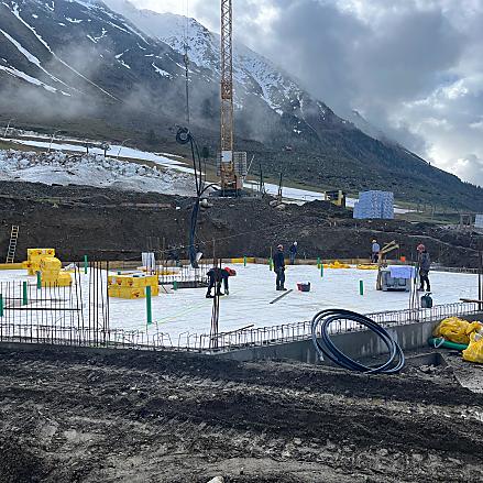 Der Rohbau der Tiefgarage mit 44 Stellplätzen ist abgeschlossen, und die Arbeiten an der Pistenraupengarage sowie der Werkstatt schreiten zügig voran.