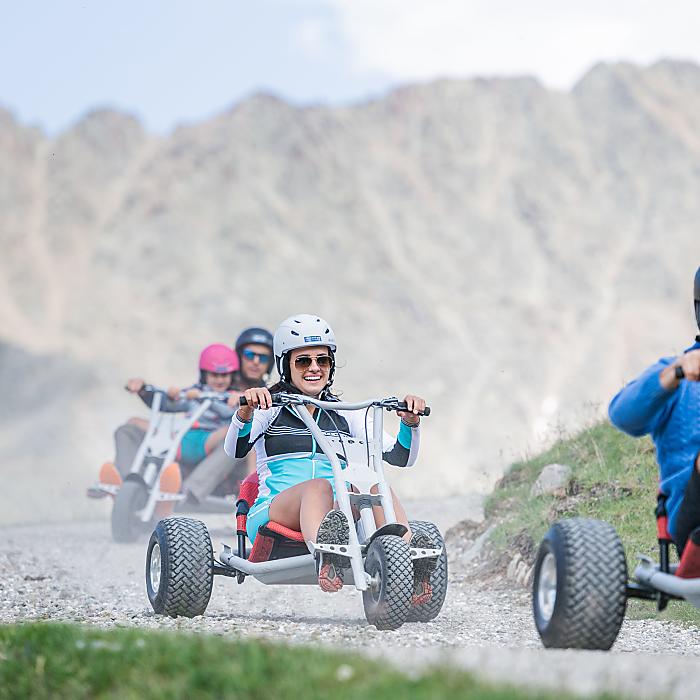 Your go-karting holidays begin with a ride on the Lazaun cable car from Maso Corto. At the mountain station, your carts will be ready and waiting for you and your companions. After a quick briefing, you’re all set – and with a friendly push from one of our staff, you’ll be rolling downhill in no time, and you won’t stop until you reach the valley floor in Maso Corto. The course covers 4 kilometres and descends more than 400 metres in elevation but trust us – the ride will fly by! No problem: the cable car will whisk you back to the top for another round.