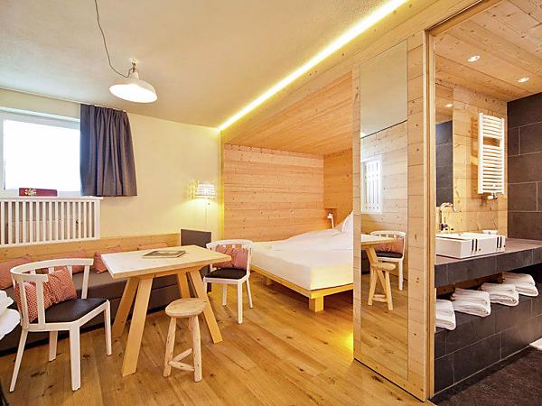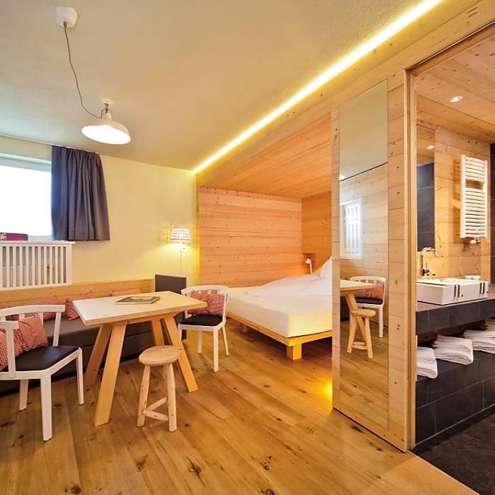 This new room, furnished in Alpine style with spruce wood, is the centrepiece of our mountain hotel in South Tyrol. You can enjoy a magnificent view of Val Senales/Schnalstal directly from the comfortable double bed. The room faces Maso Corto/Kurzras. When the weather is nice, you can see the Ortles/Ortler and the surrounding mountains. The room has a double bed, a couch, a sitting area, a modern bathroom with a shower, a TV, a telephone, and a safe. A hairdryer and free Wi-Fi are included.