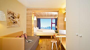 The new room, furnished with spruce wood in alpine style, offers a sensational view directly from the bed. The room faces Maso Corto. When the weather is fine, you can see King Ortler and the surrounding mountains.