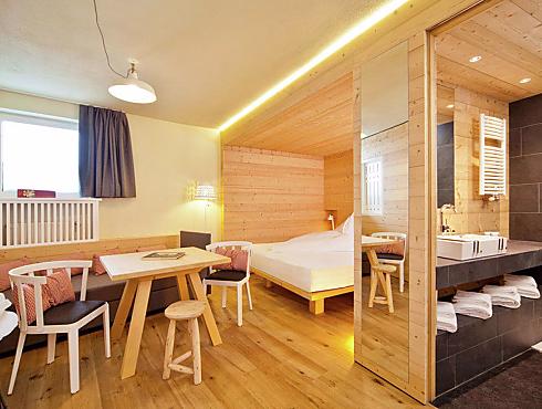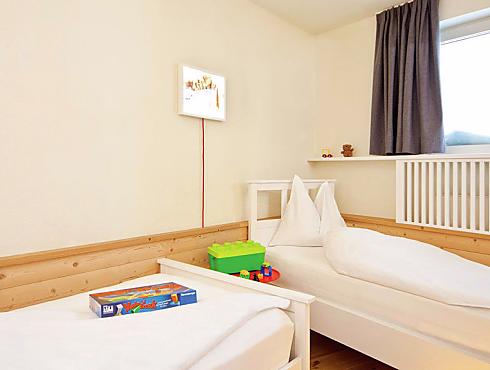The spacious family suite is furnished in a modern Alpine style with lots of wood. It has a bedroom with a sitting area, a separate bedroom with two single beds, a walk-in closet, and an elegant bathroom with a shower. The suite is equipped with a TV, a telephone, and a safe. A hairdryer and free Wi-Fi are included.