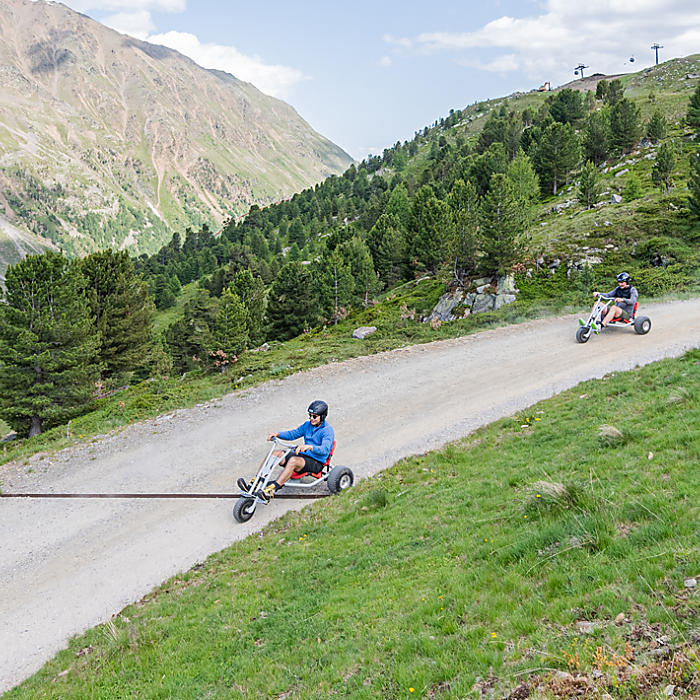 You can hire the mountain carts from Sportservice Erwin Stricker from 28th June to 5th October, on Tuesdays, Wednesday, Friday. Saturdays and Sundays. From 11th to 24th August, the mountain carts are available daily, and there is a refreshment stop at the Lazaun mountain hut.