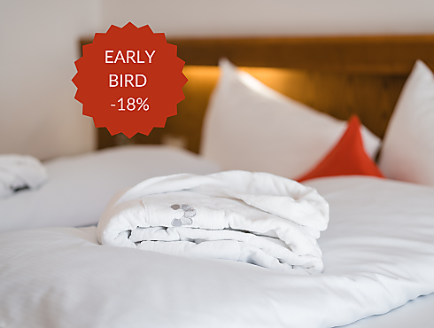 Planen Sie voraus und profitieren Sie doppelt: Wer bis 09. Mai 2026 bucht, erhält 18% Rabatt auf den Tagespreis für einen Aufenthalt ab 2 Nächten in der gesamten Saison.